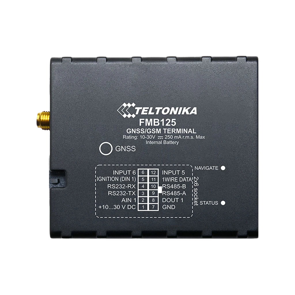 FMB125 оснащён Bluetooth и резервным аккумулятором. FMB125 предназначен для работы с различными устройствами по интерфейсам RS232 и RS485, например, цифровые датчики топлива (LLS), навигационное устройства Garmin, считыватели RFID и т. д.
