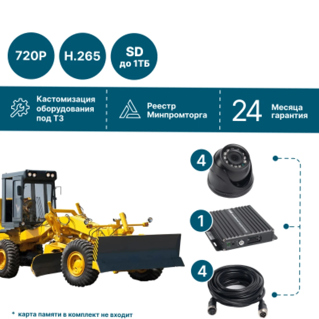 NSCAR ST401_SD — специализированный комплект видеонаблюдения для дорожной и карьерной техники. Подходит для установки на грейдеры, снегоуборщики, асфальтоукладчики, катки, разметочные машины, дорожные фрезы, поливальные машины и карьерную спецтехнику. Система обеспечивает надежную фиксацию происходящего в HD-качестве, запись ведётся на SD-карту памяти объемом до 512 ГБ.